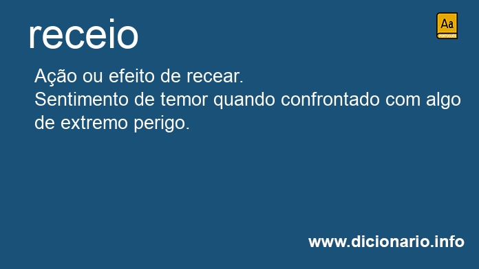 Receio é sinônimo de: escrúpulo, apreensão, cisma, desassossego, temor, sobrolho, dúvida, timidez, suspicácia, desconfiança, sobrosso, medo