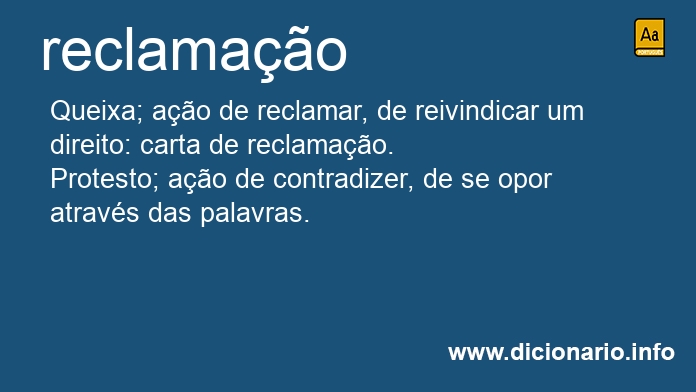 Queixa; ação de reclamar, de reivindicar um direito: carta de reclamação.