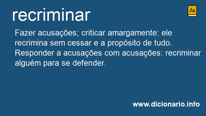 Fazer acusações; criticar amargamente: ele recrimina sem cessar e a propósito de tudo.