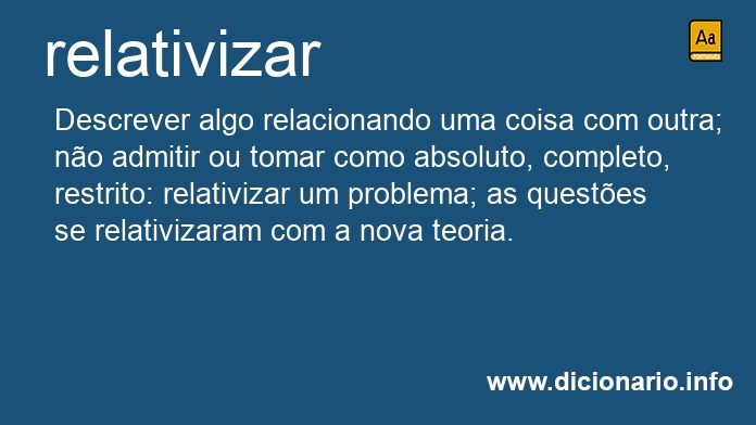 Descrever algo relacionando uma coisa com outra; não admitir ou tomar como absoluto, completo, restrito: relativizar um problema; as questões se relativizaram com a nova teoria.