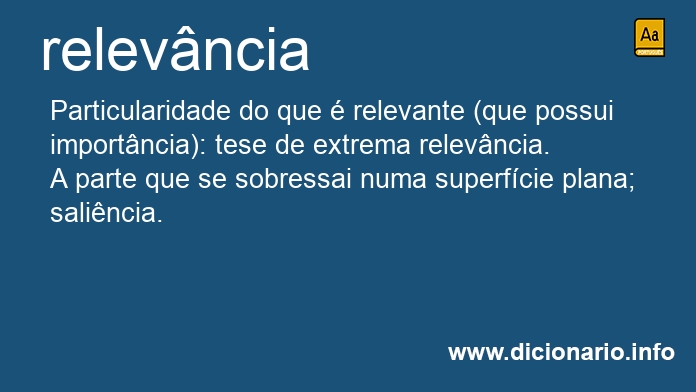 substantivo feminino Particularidade do que é relevante (que possui importância): tese de extrema relevância.