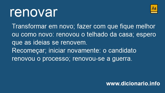 Transformar em novo; fazer com que fique melhor ou como novo: renovou o telhado da casa; espero que as ideias se renovem.