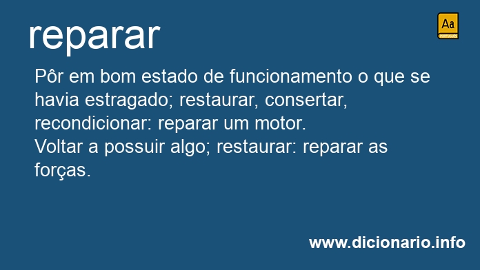 Pôr em bom estado de funcionamento o que se havia estragado; restaurar, consertar, recondicionar: reparar um motor.
