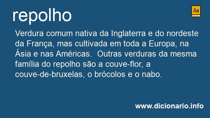 substantivo masculino Verdura comum nativa da Inglaterra e do nordeste da França, mas cultivada em toda a Europa, na Ásia e nas Américas. Outras verduras da mesma família do repolho são a couve-flor, a couve-de-bruxelas, o brócolos e o nabo.