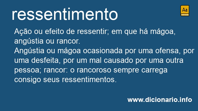 Angústia ou mágoa ocasionada por uma ofensa, por uma desfeita, por um mal causado por uma outra pessoa; rancor: o rancoroso sempre carrega consigo seus ressentimentos.