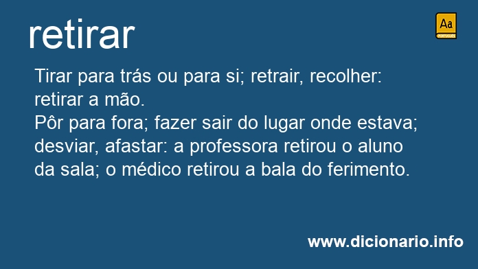 Pôr para fora; fazer sair do lugar onde estava; desviar, afastar: a professora retirou o aluno da sala; o médico retirou a bala do ferimento.