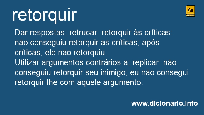 Dar respostas; retrucar: retorquir às críticas: não conseguiu retorquir as críticas; após críticas, ele não retorquiu.