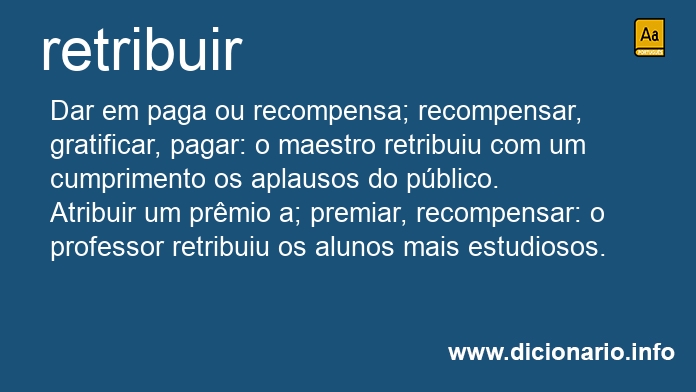 Dar em paga ou recompensa; recompensar, gratificar, pagar: o maestro retribuiu com um cumprimento os aplausos do público.