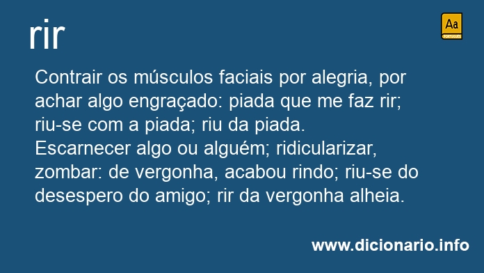 Escarnecer algo ou alguém; ridicularizar, zombar: de vergonha, acabou rindo; riu-se do desespero do amigo; rir da vergonha alheia.