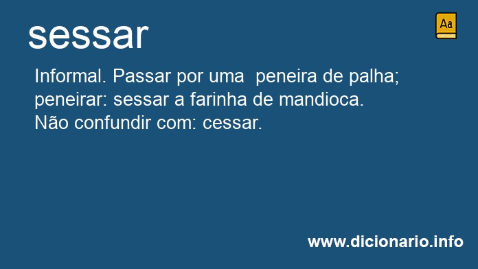 verbo transitivo direto [Brasil] Informal. Passar por uma peneira de palha; peneirar: sessar a farinha de mandioca.