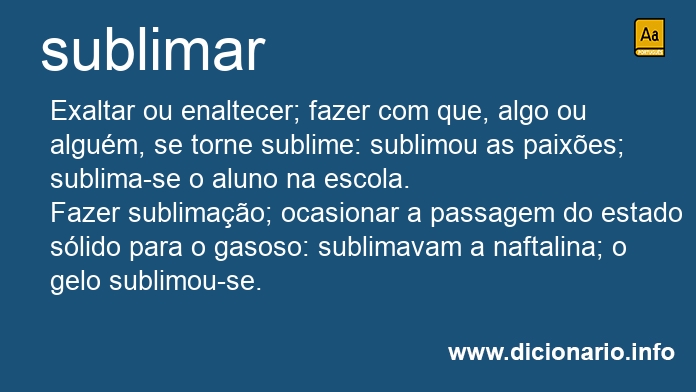 Exaltar ou enaltecer; fazer com que, algo ou alguém, se torne sublime: sublimou as paixões; sublima-se o aluno na escola.