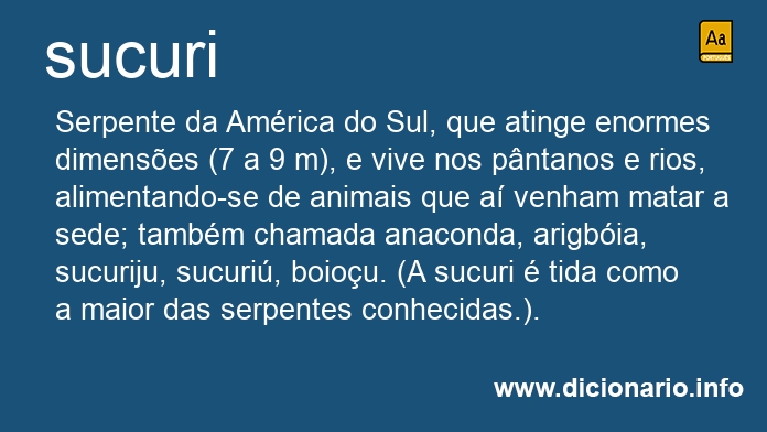 substantivo feminino Serpente da América do Sul, que atinge enormes dimensões (7 a 9 m), e vive nos pântanos e rios, alimentando-se de animais que aí venham matar a sede; também chamada anaconda, arigbóia, sucuriju, sucuriú, boioçu. (A sucuri é tida como a maior das serpentes conhecidas.).