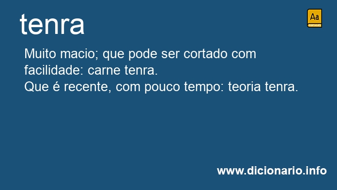 Tenra é sinônimo de: mole, macio, jovem, pequeno, delicado, recente, viçoso, nova, verde, fresca, viçosa