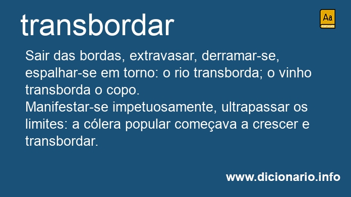 Sair das bordas, extravasar, derramar-se, espalhar-se em torno: o rio transborda; o vinho transborda o copo.