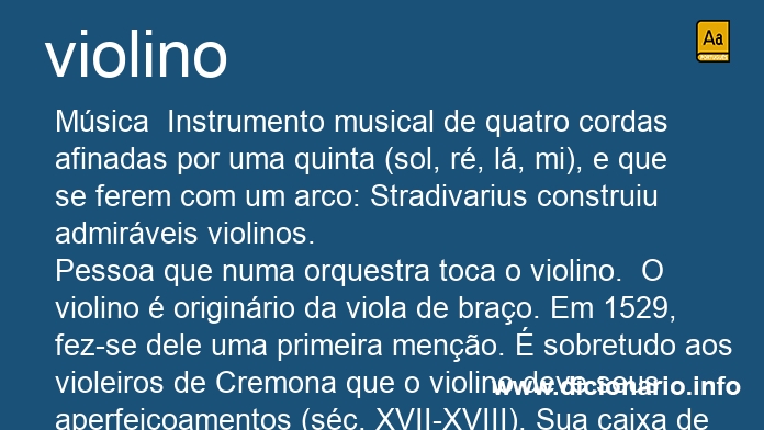 substantivo masculino Música Instrumento musical de quatro cordas afinadas por uma quinta (sol, ré, lá, mi), e que se ferem com um arco: Stradivarius construiu admiráveis violinos.