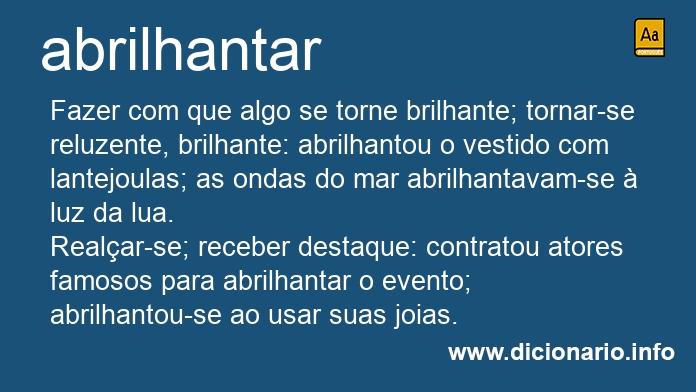 Fazer com que algo se torne brilhante; tornar-se reluzente, brilhante: abrilhantou o vestido com lantejoulas; as ondas do mar abrilhantavam-se à luz da lua.