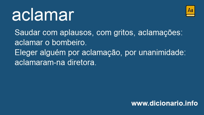Eleger alguém por aclamação, por unanimidade: aclamaram-na diretora.