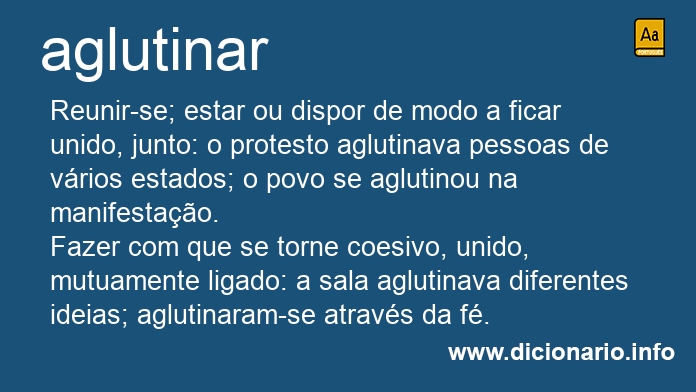 Reunir-se; estar ou dispor de modo a ficar unido, junto: o protesto aglutinava pessoas de vários estados; o povo se aglutinou na manifestação.