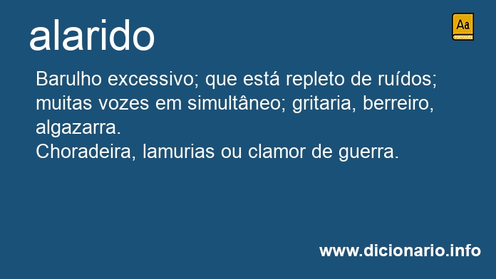 Alarido é sinônimo de: matinada, gritaria, chinfrim, celeuma, berreiro, banzé, balbúrdia, algazarra, tropel