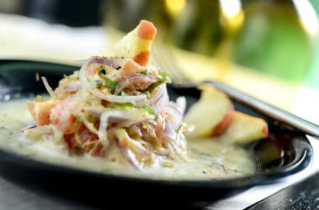 Ingredientes: ½ cebola roxa cortada em Juliana fina (ou em tiras bem finas) 1 caju maduro (batido sem casca) 200 g de salmão Sal e pimenta-do-reino a gosto ½ xícara (chá) de suco de limão 2 pimentas-de-cheiro sem sementes, cortada em Julianne (ou em tirar bem finas) ½ colher (chá) de gengibre picado fino 1 colher (chá) ?