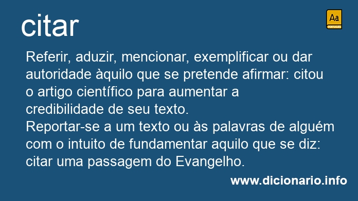 Referir, aduzir, mencionar, exemplificar ou dar autoridade àquilo que se pretende afirmar: citou o artigo científico para aumentar a credibilidade de seu texto.