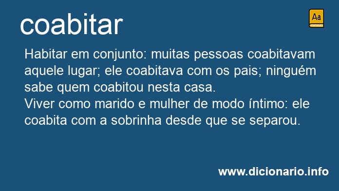 Habitar em conjunto: muitas pessoas coabitavam aquele lugar; ele coabitava com os pais; ninguém sabe quem coabitou nesta casa.