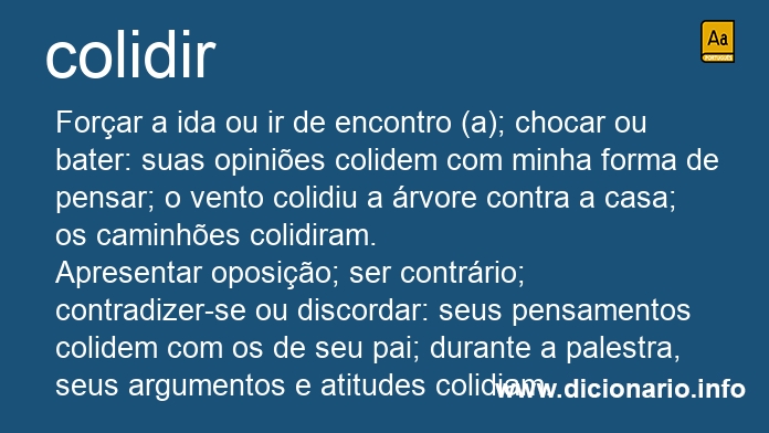 Forçar a ida ou ir de encontro (a); chocar ou bater: suas opiniões colidem com minha forma de pensar; o vento colidiu a árvore contra a casa; os caminhões colidiram.