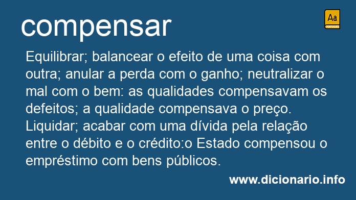 Equilibrar; balancear o efeito de uma coisa com outra; anular a perda com o ganho; neutralizar o mal com o bem: as qualidades compensavam os defeitos; a qualidade compensava o preço.