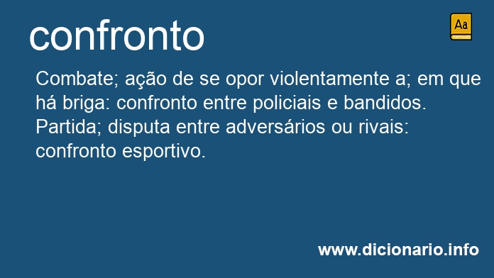 Confronto é sinônimo de: paralelo, partida, comparação, confrontação, combate, acareação, cotejo