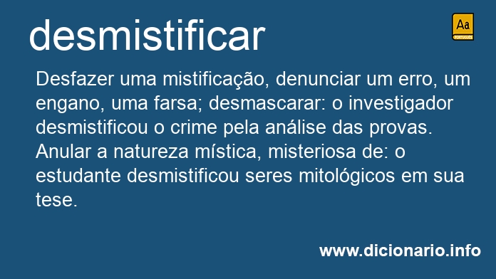 Desfazer uma mistificação, denunciar um erro, um engano, uma farsa; desmascarar: o investigador desmistificou o crime pela análise das provas.