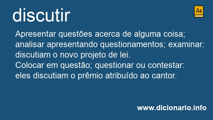 Apresentar questões acerca de alguma coisa; analisar apresentando questionamentos; examinar: discutiam o novo projeto de lei.