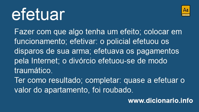 Fazer com que algo tenha um efeito; colocar em funcionamento; efetivar: o policial efetuou os disparos de sua arma; efetuava os pagamentos pela Internet; o divórcio efetuou-se de modo traumático.