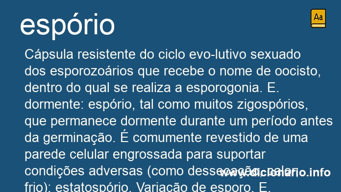 [Zoologia] Cápsula resistente do ciclo evolutivo sexuado dos esporozoários que recebe o nome de oocisto, dentro do qual se realiza a esporogonia. E. dormente: espório, tal como muitos zigospórios, que permanece dormente durante um período antes da germinação. É comumente revestido de uma parede celular engrossada para suportar condições adversas (como dessecação, calor, frio); estatospório. Variação de esporo. E. secundário, Bot: espório de um basidiomicete, que não é basidiomicete; esporídio.
