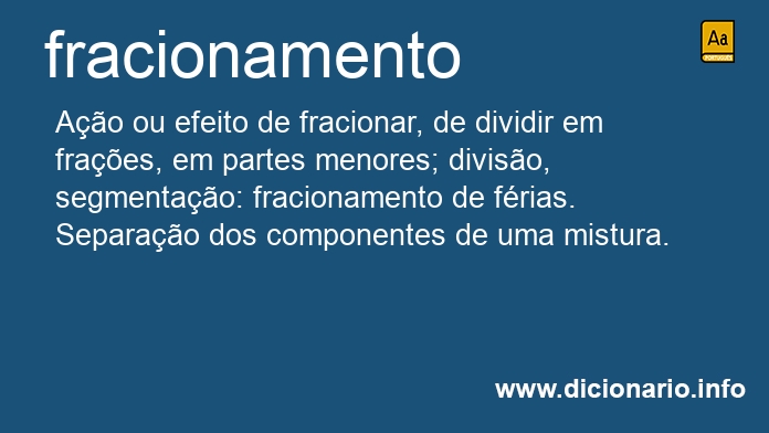 substantivo masculino Ação ou efeito de fracionar, de dividir em frações, em partes menores; divisão, segmentação: fracionamento de férias.
