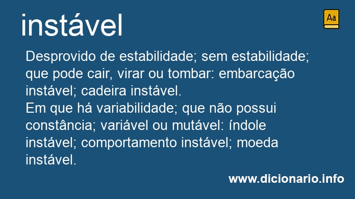 adjetivo masculino e feminino Desprovido de estabilidade; sem estabilidade; que pode cair, virar ou tombar: embarcação instável; cadeira instável.