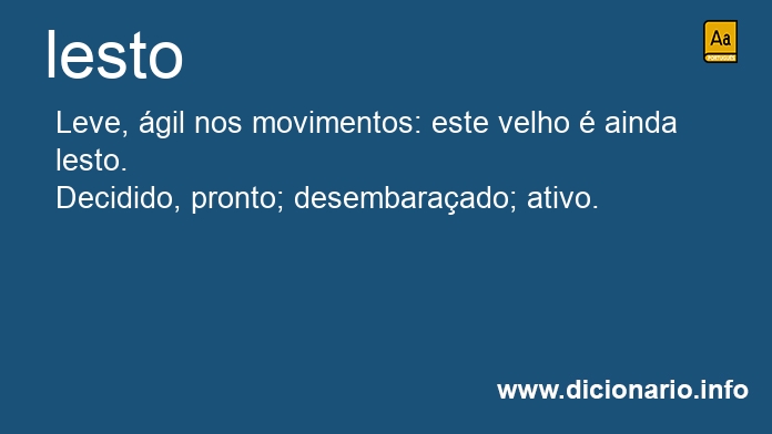 Lesto é sinônimo de: expedito, esperto, ligeiro, desembaraçado, ágil, decidido, vivo, ative