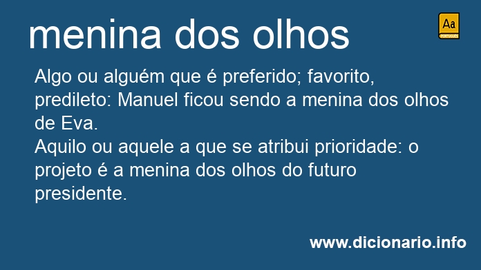 substantivo feminino Algo ou alguém que é preferido; favorito, predileto: Manuel ficou sendo a menina dos olhos de Eva.