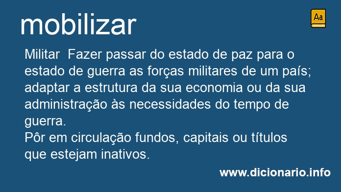 Militar Fazer passar do estado de paz para o estado de guerra as forças militares de um país; adaptar a estrutura da sua economia ou da sua administração às necessidades do tempo de guerra.