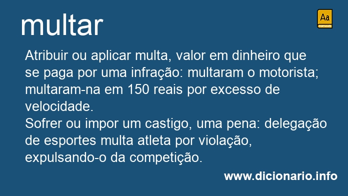 verbo transitivo direto e bitransitivo Atribuir ou aplicar multa, valor em dinheiro que se paga por uma infração: multaram o motorista; multaram-na em 150 reais por excesso de velocidade.
