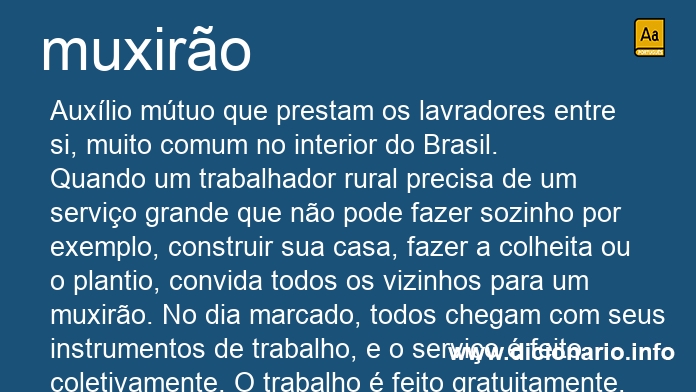 Quando um trabalhador rural precisa de um serviço grande que não pode fazer sozinho por exemplo, construir sua casa, fazer a colheita ou o plantio, convida todos os vizinhos para um muxirão. No dia marcado, todos chegam com seus instrumentos de trabalho, e o serviço é feito coletivamente. O trabalho é feito gratuitamente, mas o camponês beneficiado com o serviço deve garantir a comida e a bebida. (A palavra tem numerosos sinônimos e variantes regionais: mutirão, putirão, ademão, adjutório.).