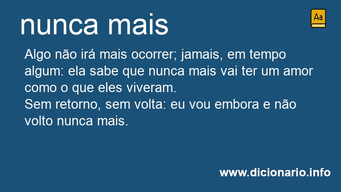 locução adverbial Algo não irá mais ocorrer; jamais, em tempo algum: ela sabe que nunca mais vai ter um amor como o que eles viveram.