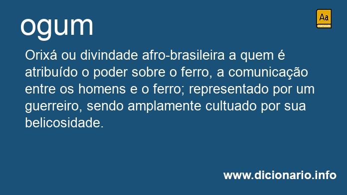 substantivo masculino Orixá ou divindade afro-brasileira a quem é atribuído o poder sobre o ferro, a comunicação entre os homens e o ferro; representado por um guerreiro, sendo amplamente cultuado por sua belicosidade.
