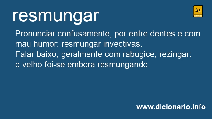 Falar baixo, geralmente com rabugice; rezingar: o velho foi-se embora resmungando.