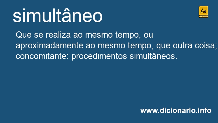 Que se realiza ao mesmo tempo, ou aproximadamente ao mesmo tempo, que outra coisa; concomitante: procedimentos simultâneos.