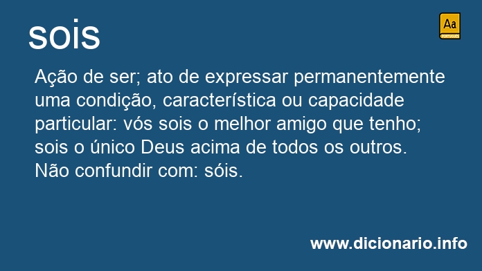 substantivo deverbal Ação de ser; ato de expressar permanentemente uma condição, característica ou capacidade particular: vós sois o melhor amigo que tenho; sois o único Deus acima de todos os outros.