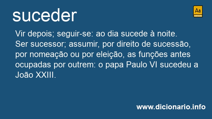 Ser sucessor; assumir, por direito de sucessão, por nomeação ou por eleição, as funções antes ocupadas por outrem: o papa Paulo VI sucedeu a João XXIII.