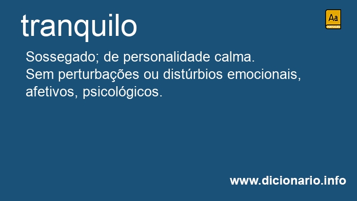 Tranquilo é sinônimo de: imperturbado, sossegado, repousado, despreocupado, calmo, garantido, remansado, descansado, manso, sereno