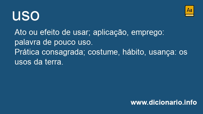 substantivo masculino Ato ou efeito de usar; aplicação, emprego: palavra de pouco uso.