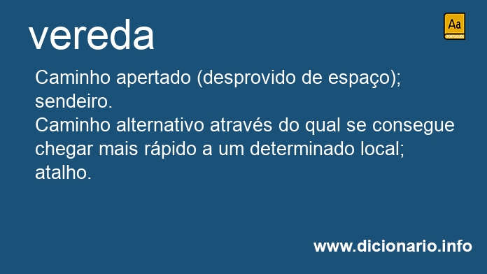 Vereda é sinônimo de: atalho, caminho, estrada, senda, trilho, rumo, direção, circunstância, sendeiro, tramite